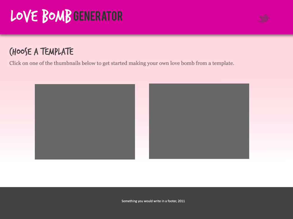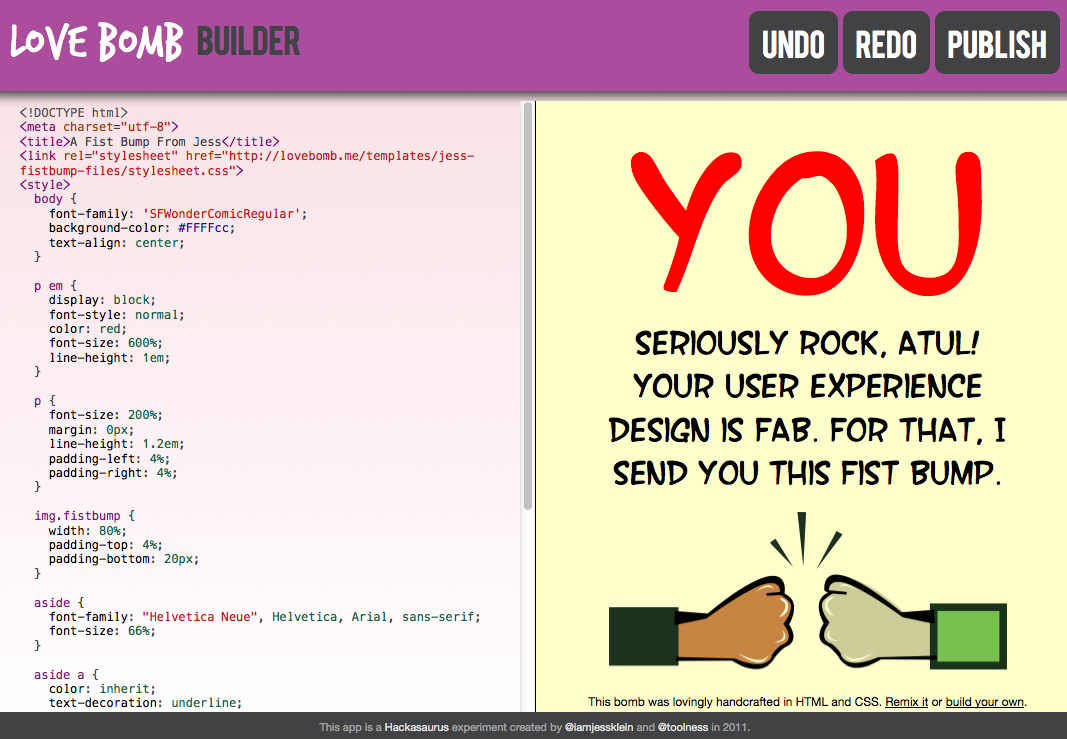What was kind of fun and happenstance- was that I was running a bunch of workshops for teenagers at the exact time that we were tinkering with the idea. Atul had whipped up a prototype of what we are calling the Webpage Maker- a tool that will help users go from hackers to webmakers. I tested that tool with youth- and while iterating on both tools at the same time, somehow the two combined and became the current version of the lovebomb.